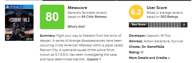메타 스코어 80점으로 전 시리즈 바이오 하자드 2 메타스코어 91에 비하면