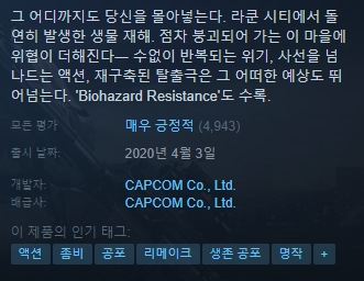 그래도 역시 평소 바이오 하자드 팬이였던 분들은 퀄리티 면에선 충분히 기대에 부응할만큼 잘만들어진 게임 입니다.
